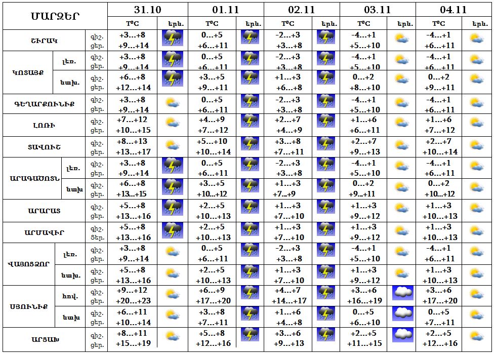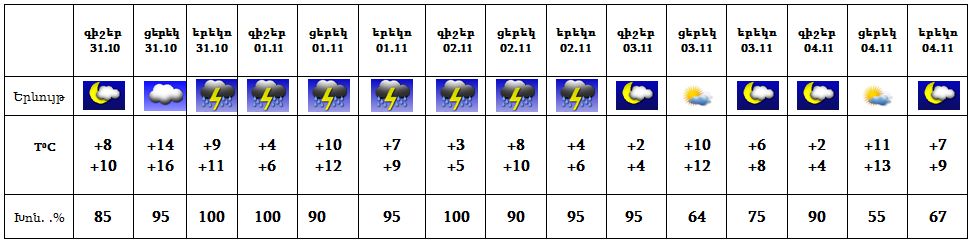 Հոկտեմբերի 31-ին արևմտյան շրջաններում, նոյեմբերի 1-2-ը շրջանների զգալի մասում սպասվում է անձրև և ամպրոպ, առանձին շրջաններում՝ քամու ուժգնացում՝ 15-20 մ/վ արագությամբ: 3-4-ը սպասվում է առավելապես առանց տեղումների եղանակ:
