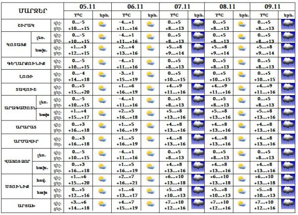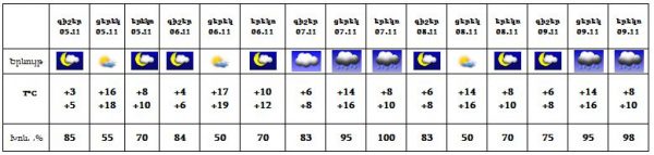 Նոյեմբերի 5-6-ը, 8-ին սպասվում է առանց տեղումների եղանակ։ 7-ին, 9-ին սպասվում է անձրև:
