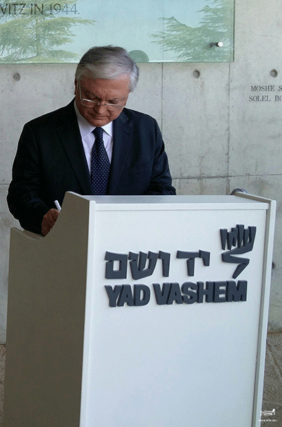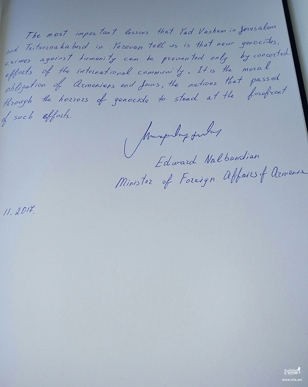 Հոլոքոստի թանգարանում ունեցած շրջայցից հետո Հայաստանի ԱԳ նախարարը գրառում կատարեց Յադ Վաշեմի պատվավոր հյուրերի հուշամատյանում, որտեղ ասվում է. «Կարևորագույն դասը, որ քաղում ենք Երուսաղեմում Յադ Վաշեմ և Երևանում Ծիծեռնակաբերդ այցելելիս, այն է, որ նոր ցեղասպանությունները և մարդկության դեմ հանցագործություները կարող են կանխվել միայն միջազգային հանրության միասնական ջանքերի շնորհիվ: Ցեղասպանության սարսափների միջով անցած հայ և հրեա ժողովուրդների բարոյական պարտականությունն է կանգնել այս ջանքերի առաջնագծում»: