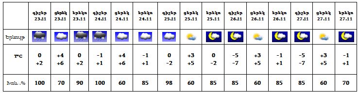 Նոյեմբերի 23-ի և 24-ի գիշերը ժամանակ առ ժամանակ սպասվում են տեղումներ, բարձրադիր հատվածներում՝ թաց ձյան, ցածրադիր հատվածներում՝ ձնախառն անձրևի տեսքով, 23-ի և 24-ի ցերեկը սպասվում է փոփոխական ամպամածություն, տեղումների հավանականությունը փոքր է: 25-27-ը սպասվում է առանց տեղումների եղանակ: