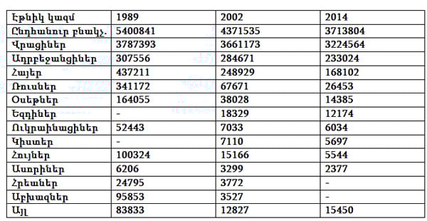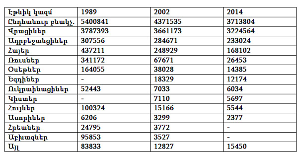 Աղյուսակ 1. Վրաստանի բնակչության և էթնիկ կազմի թվի փոփոխություններն ըստ 1989, 2002 և 2014թթ. մարդահամարների տվյալների[2],[3]