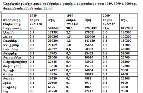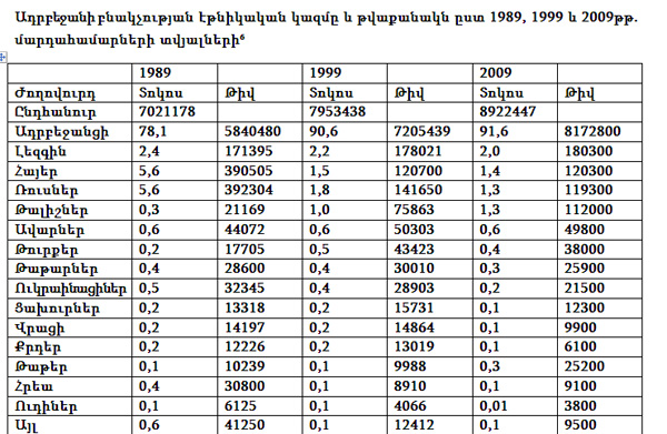 1989-2009թթ. մարդահամարների միջև ընկած ժամանակահատվածում ոչ միայն փոխվել է Ադրբեջանի բնակչության թիվը, այլև լուրջ փոփոխությունների է ենթարկվել նաև էթնիկական կազմը: Ղարաբաղյան շարժումից ի վեր Ադրբեջանում հայկական ջարդերի ու էթնիկ հայերի արտաքսման հետևանքով արդեն իսկ 1991թ. Ադրբեջանի տարածքում հայ ազգաբնակչություն չէր մնացել: Հայերի մեծ մասն ապաստանեց Հայաստանում, ինչպես նաև Ռուսաստանի Դաշնությունում, Եվրոպական երկրներում և ԱՄՆ-ում: Քաղաքական նկատառումներից ելնելով՝ Ադրբեջանը դեռևս հաշվառում է ԼՂ հայ ազգաբնակչությանը և նրանց համարում իր երկրի քաղաքացիներ: