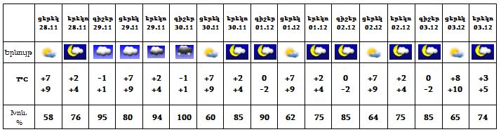 Նոյեմբերի 28-ի ցերեկը, 30-ի ցերեկը, դեկտեմբերի 1-3-ը սպասվում է առանց տեղումների եղանակ: Նոյեմբերի 29-ին՝ օրվա երկրորդ կեսին, 30-ի գիշերը սպասվում են տեղումներ: