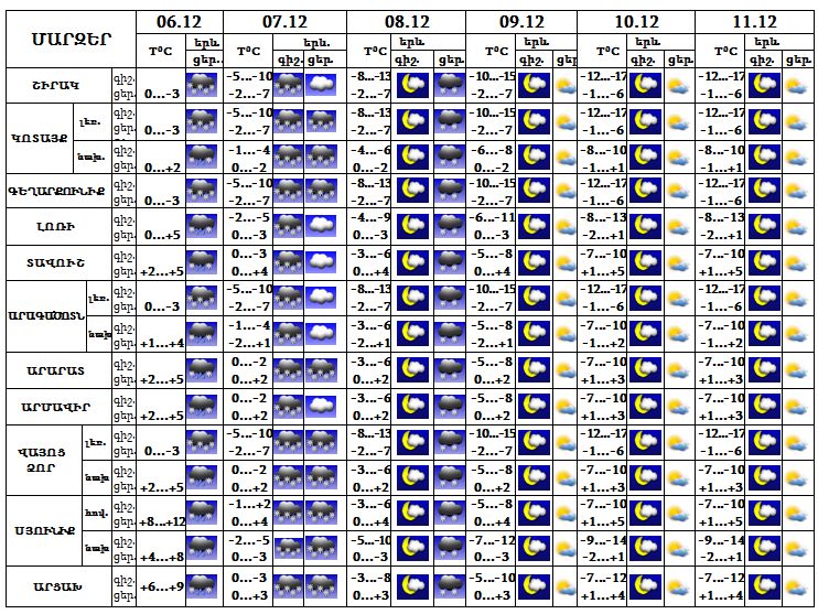 Երևանում այսօր սպասվում են տեղումներ թաց ձյան և ձնախառն անձրևի տեսքով։ Երեկոյան ժամերից տեղումները կվերափոխվեն ձյան և կշարունակվեն մինչև դեկտեմբերի 7-ի առավոտ, որից հետո աստիճանաբար կդադարեն: Դեկտեմբերի 8-ին կրկին հնարավոր է թույլ ձյուն։ Դեկտեմբերի 9-11-ը սպասվում է առանց տեղումների եղանակ: 6-8-ը սպասվում է քամու ուժգնացում՝ 15-20 մ/վ: