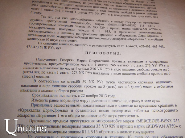 «Առավոտի» տրամադրության տակ է 2013թ. նոյեմբերի 22-ին «Հանուն Ուզբեկստանի Հանրապետության» երեք մեքենագիր էջից բաղկացած դատավճիռը: Ժողդատավորներն են եղել Բ. Շախանովը, Ա. Կենժեմուրատը, Լ.Կերուենբաեւը: Ուշադրության արժանի է այն, որ մեղադրողը եղել է դատախազի օգնականի կարգավիճակով Ա. Բախտիյարովը: Մեր քաղաքացու պաշտպանությունն իրականացրել է «YURIKON» փաստաբանական գրասենյակի փաստաբան, ազգությամբ ռուս Ն. Բեզոուչենկոյը: