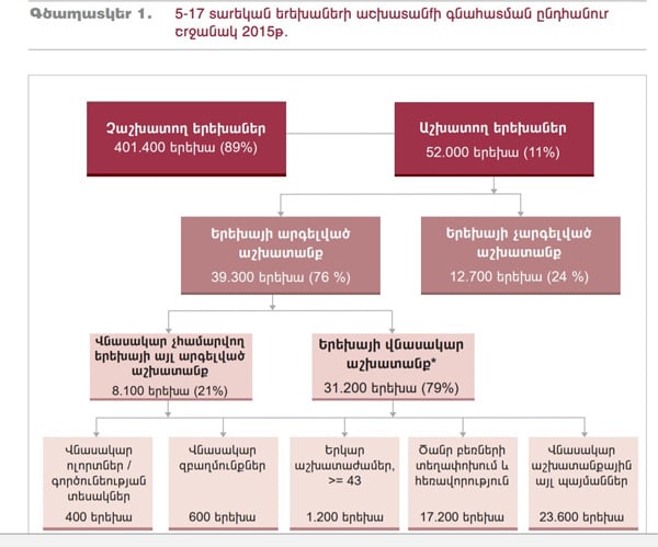 Ընդ որում, ըստ զեկույցի՝ 52 հազար աշխատող երեխաներից 39 հազար 300-ը արգելված աշխատանք է կատարել, նույն 52 հազարից 31 հազար 200-ը երեխայի համար վնասակար աշխատանք է կատարել: