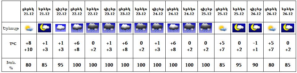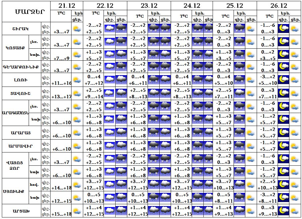 Դեկտեմբերի 21-ի ցերեկը, 25-ի ցերեկը, 26-ին սպասվում է առանց տեղումների եղանակ, 22-ի ցերեկը, 23-24-ը, 25-ի գիշերը շրջանների զգալի մասում ժամանակ առ ժամանակ, դադարներով, սպասվում են տեղումներ և մառախուղ: