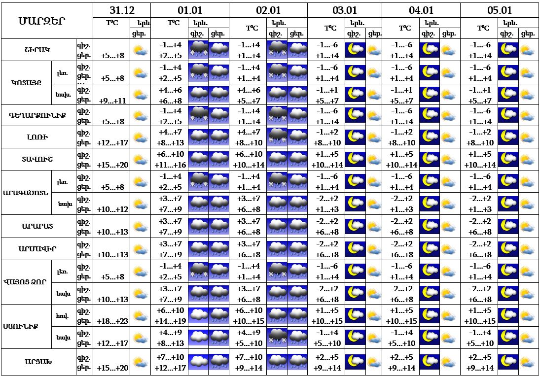 Դեկտեմբերի 31-ի ցերեկը, հունվարի 3-5-ին սպասվում է առանց տեղումների եղանակ: Հունվարի 1-2-ին ժամանակ առ ժամանակ սպասվում են տեղումներ:
