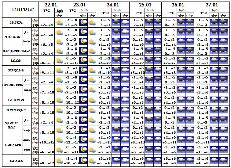 Հունվարի 22-ի ցերեկը, 23-ին սպասվում է առանց տեղումների եղանակ: 24-27-ը ժամանակ առ ժամանակ սպասվում են տեղումներ: