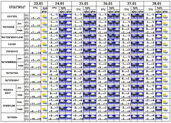 Հունվարի 23-ի ցերեկը, 28-ին սպասվում է առանց տեղումների եղանակ: 24-27-ը շրջանների զգալի մասում ժամանակ առ ժամանակ սպասվում են տեղումներ, առանձին վայրերում` քամու ուժգնացում՝ 15-20 մ/վ արագությամբ: