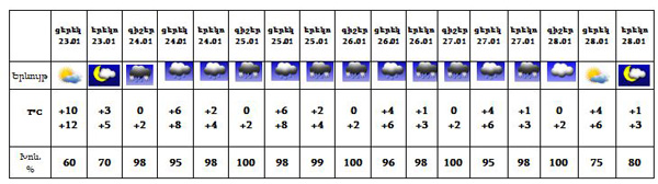 Հունվարի 23-ի ցերեկը, 28-ին սպասվում է առանց տեղումների եղանակ: 24-27-ը ժամանակ առ ժամանակ սպասվում են տեղումներ: