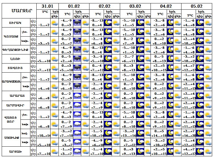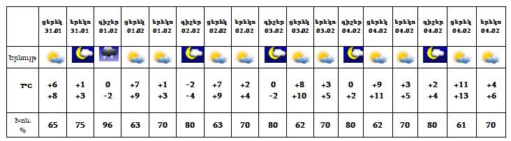 Հունվարի 31-ի ցերեկը, փետրվարի 1-ի ցերեկը, 2-5-ը սպասվում է առանց տեղումների եղանակ: Փետրվարի 1-ի գիշերը առանձին շրջաններում սպասվում է թույլ ձյուն:
