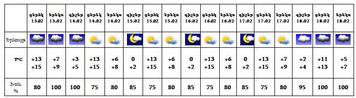 Փետրվարի 13-ին՝ օրվա երկրորդ կեսին, 14-ի գիշերը, 18-ին ժամանակ առ ժամանակ սպասվում է անձրև, 14-ի ցերեկը, 15-17-ը սպասվում է առանց տեղումների եղանակ: