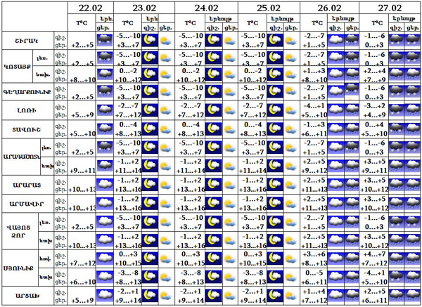 Փետրվարի 22-ի ցերեկն առանձին շրջաններում, 26-27-ը շրջանների զգալի մասում ժամանակ առ ժամանակ սպասվում են տեղումներ: 23-25-ը սպասվում է առանց տեղումների եղանակ: