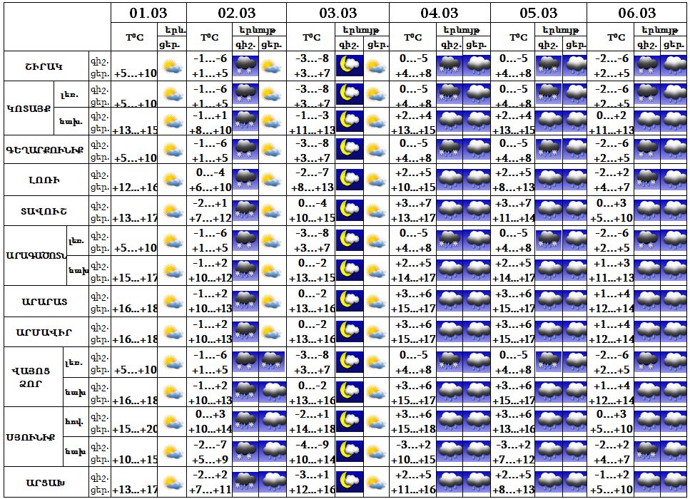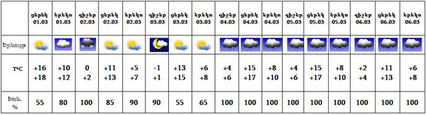 Մարտի 1-ի ուշ երեկոյան, 2-ի գիշերը և առավոտյան ժամերին, 4-6-ը ժամանակ առ ժամանակ շրջանների զգալի մասում, 2-ի ցերեկը Վայոց ձորում, Սյունիքում և Արցախում սպասվում են տեղումներ: Մարտի 3-ին սպասվում է առանց տեղումների եղանակ: