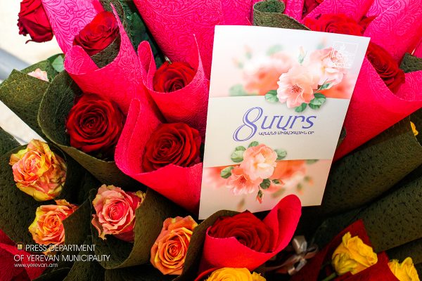 Մարտի 8-ին ընդառաջ Երևանի քաղաքապետարանի երկու մասնաշենքերի, ինչպես նաև վարչական շրջանների աշխատակազմերի քաղաքացիների սպասարկման «Մեկ պատուհան» գրասենյակ այցելող բոլոր կանանց ու աղջիկներին դիմավորել են Երևանի քաղաքապետի շնորհավորական բացիկներով և ծաղիկներով:
