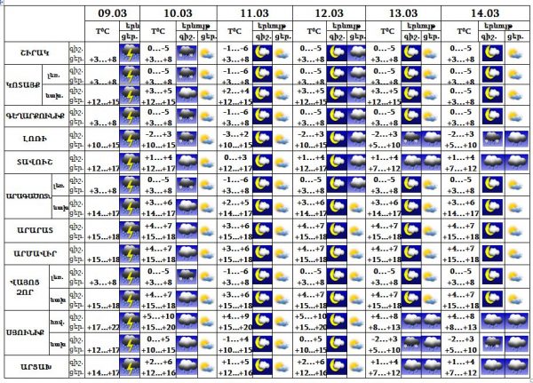 Մարտի 9-ի ցերեկը, 10-ի գիշերը շրջանների զգալի մասում ժամանակ առ ժամանակ, 12-ին` օրվա երկրորդ կեսին, հյուսիսային շրջաններում, 13-14-ին Լոռիում, Տավուշում, Սյունիքում և Արցախում սպասվում են տեղումներ: Մարտի 10-ի ցերեկը, 11-ին, 12-ի գիշերն սպասվում է առանց տեղումների եղանակ: