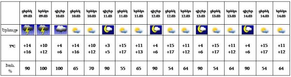 Մարտի 9-ի ցերեկը, 10-ի գիշերը ժամանակ առ ժամանակ սպասվում է անձրև և ամպրոպ, 10-ի ցերեկը, 11-14-ն սպասվում է առանց տեղումների եղանակ: Մարտի 9-ին սպասվում է քամու ուժգնացում՝ 15-20 մ/վ արագությամբ: