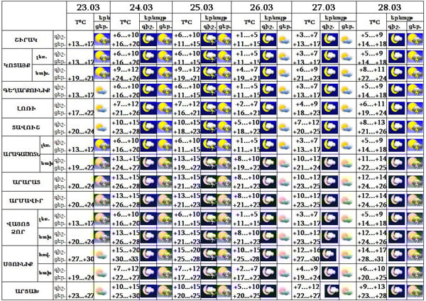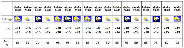 Մարտի 23-ի օրվա առաջին կեսին արևմտյան շրջաններում, 24-ի ուշ երեկոյան ժամերին, 25-ին, 28-ի երեկոյան շրջանների զգալի մասում, սպասվում է կարճատև անձրև և ամպրոպ: 24-ի գիշերը, 26-27-ը, 28-ի գիշերը սպասվում է առանց տեղումների եղանակ: