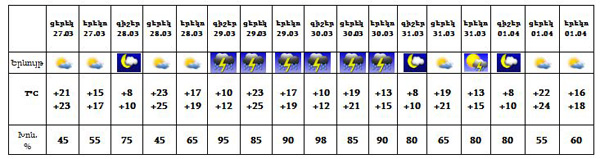 Մարտի 27-ի ցերեկը, 28-ին, ապրիլի 1-ին սպասվում է առանց տեղումների եղանակ: Մարտի 29-30-ը ժամանակ առ ժամաանակ սպասվում է անձրև և ամպրոպ: Մարտի 31-ին՝ կեսօրից հետո, սպասվում է կարճատև անձրև և ամպրոպ:
