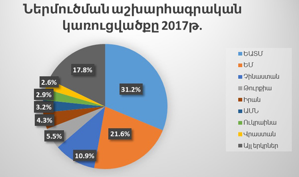 ՀՀ ներմուծման գործընկերների շարքում իր կայուն դիրքն է գրավել նաև ԵՄ-ը: 2017թ. հունվար-դեկտեմբեր ամիսներին ԵՄ-ից ներմուծման ծավալը կազմել է շուրջ $903 մլն, որը կազմում է մեր ներմուծման 21.6%-ը: Ընդ որում, 2016թ.-ի համեմատ ԵՄ-ից ներմուծման ծավալները նույնպես աճել են բավականին բարձր տեմպերով. հավելաճի տեմպը գերազանցել է 27%-ը: Այսինքն, ԵՄ-ից ներմուծումն ավելի արագ է աճում, քան ԵԱՏՄ-ից: