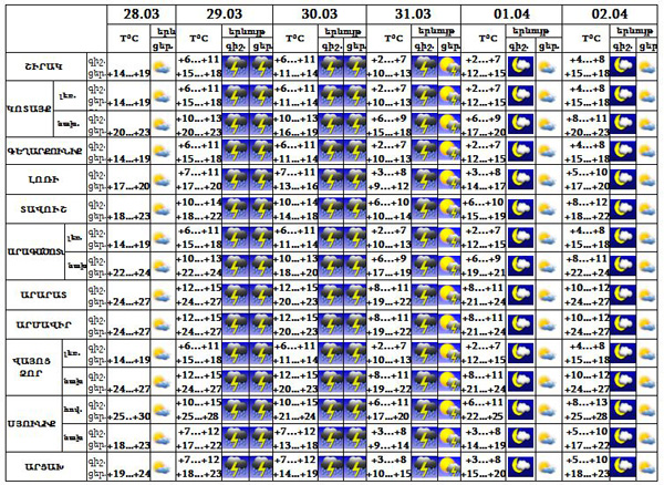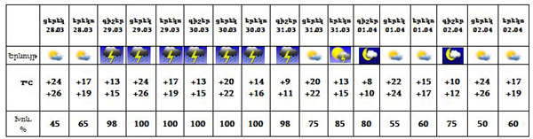 Մարտի 28-ի ցերեկը, ապրիլի 1-2-ը սպասվում է առանց տեղումների եղանակ: Մարտի 29-31-ը ժամանակ առ ժամանակ ողջ հանրապետությունում սպասվում է անձրև և ամպրոպ, առանձին հատվածներում՝ ուժեղ: