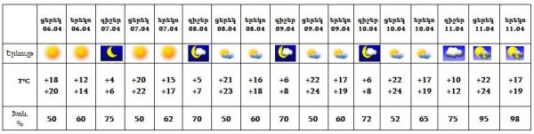 Օդի ջերմաստիճանն ապրիլի 6-9-ը, բացառությամբ Լոռու, Տավուշի, Սյունիքի մարզերի և Արցախի, աստիճանաբար կբարձրանա 3-4 աստիճանով, 11-ի գիշերն ամենուրեք կբարձրանա 4-5 աստիճանով: