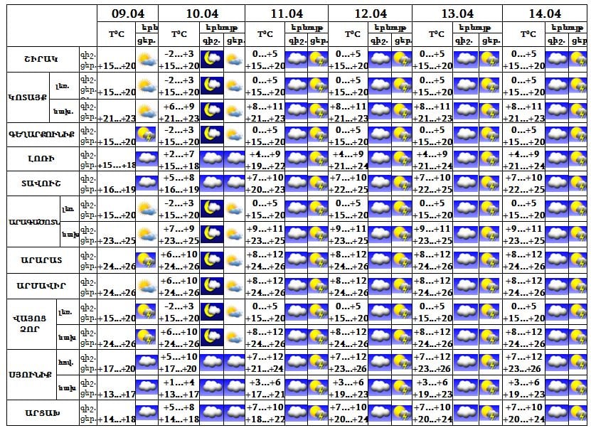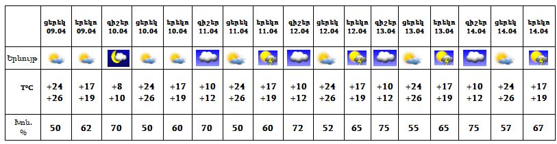 Ապրիլի 9-ի ցերեկը, 10-ին սպասվում է առանց տեղումների եղանակ, 11-14-ը՝ երեկոյան ժամերին, հնարավոր է կարճատև անձրև և ամպրոպ: