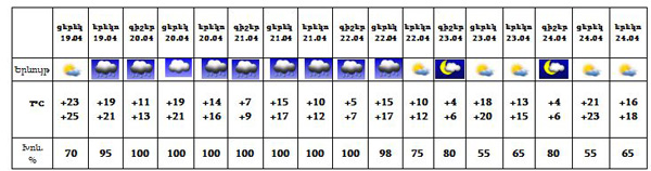 Ապրիլի 19-ին, 20-ին՝ կեսօրից հետո, 21-22-ը ժամանակ առ ժամանակ սպասվում է անձրև, 23-24-ը սպասվում է առանց տեղումների եղանակ: