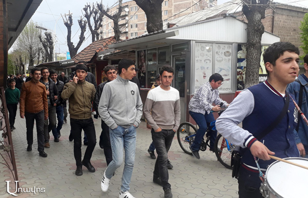 Վանաձորում մի խումբ երիտասարդներ քայլում են քաղաքի կենտրոնական փողոցներով, իրազեկելով երեկոյան տեղի ունեցող հանրահավաքի մասին: «Միացում» եւ «Վանաձորը Սերժին ասում է՝ ո՛չ» վանկարկումներով, երթի մասնակիցները վանաձորցիներին եւս մեկ անգամ կոչ են անում միանալ ցույցին: