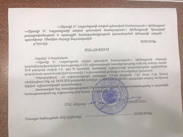 Անահիտ Ֆարմանյանի պատմելով՝ ռեկտորը ծանուցում է ուղարկել, թե կառուցվածքային փոփոխություններ է կատարել, ինչի արդյունքում էլ Ֆարմանյանի մասնագիտական հմտությունների կարիքը չկա: