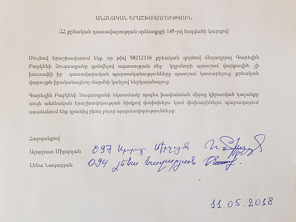 Ես և Լենա Նազարյանը երաշխավորություն ներկայացրեցինք Գարեգին Չուգասզյանի խափանման միջոցը փոխելու վերաբերյալ
