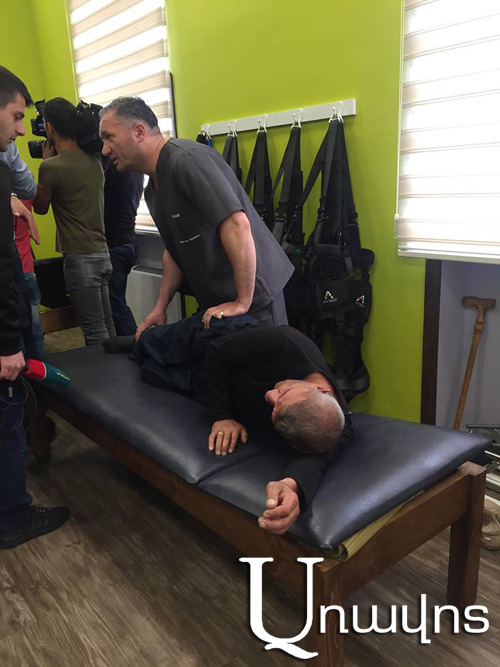 Արմեն Սարգսյանը շրջեց վերականգնողական կենտրոնում, խոսեց բուժում անցնող զինվորների հետ, հարցուփորձ արեց, թե ինչի կարիք ունեն: Կենտրոնի տնօրենն ասաց, որ զինհաշմանդամները, վիրավորված զինվորներին դեղորայքը պետպատվերով չի տրվում եւ սովորաբար նրանք ստիպված են թանկարժեք դեղորայքը սեփական միջոցներով գնել: Նախագահը հորդորեց կարեւոր խնդիրների ցանկ կազմել եւ տրամադրել իրեն, զարմանալով, որ հայրենիքի համար կյանքը վտանգող զինվորի դեղերը պետպատվերով չեն: Կենտրոնում բուժում անցնող զինվորներից մեկը՝ Ռոբերտ Դալլաքյանը, նախագահին ասաց, որ հետագա բուժումը՝ պլաստիկ վիրահատությունը պետք է շարունակի Գերմանիայում, սակայն այդ պահին դեսպանատանն այլեւս հարցազրույցի համար ազատ ժամ չկա, հետեւաբար իր բուժումը կհետաձգվի: Նախագահը խոստացավ արտաքին գործերի նախարարի հետ հարցը քննարկել եւ հնարավորն անել, որպեսզի զինվորի բուժումը չընդհատվի: Արմեն Սարգսյանը մանրամասն հետաքրքրվում էր, թե որ սարքը ինչի համար է, զինվորներին հարցուփորձ անում առողջական վիճակի մասին: