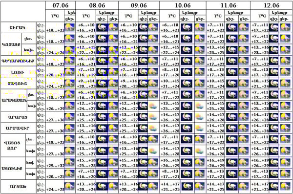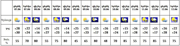 Հունիսի 7-8-ը, 11-12-ը՝ երեկոյան ժամերին և գիշերվա առաջին կեսին, սպասվում է կարճատև անձրև և ամպրոպ, ամպրոպի ժամանակ` քամու ուժգնացում՝ 15-20 մ/վ արագությամբ: 9-10-ն անձրևի հավանականությունը փոքր է: