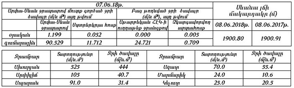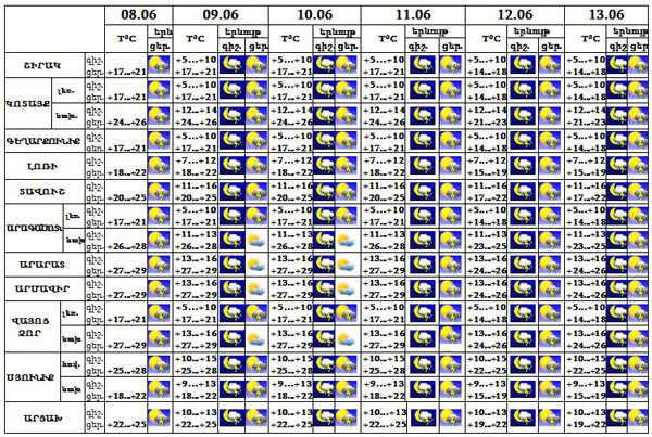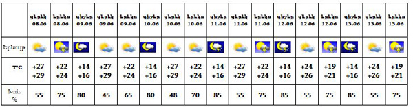 Հունիսի 8-ին, 11-13-ի երեկոյան ժամերին և գիշերվա առաջին կեսին սպասվում է կարճատև անձրև և ամպրոպ, ամպրոպի ժամանակ` քամու ուժգնացում` 15-20 մ/վ արագությամբ: 9-10-ն անձրևի հավանականությունը փոքր է: