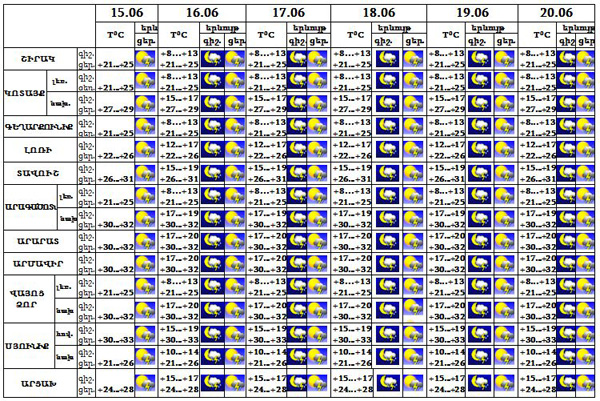Հունիսի 15-ի երեկոյան ժամերին, 16-20-ի գիշերը և երեկոյան ժամերին շրջանների զգալի մասում սպասվում է անձրև և ամպրոպ, ամպրոպի ժամանակ` քամու ուժգնացում` 15-20 մ/վ արագությամբ, առանձին հատվածներում հնարավոր է նաև կարկուտ: