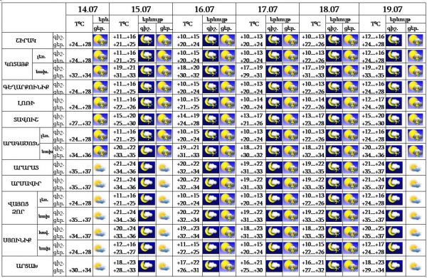 Հուլիսի 14-ին, 15-ին և 19-ին առանձին շրջաններում, 16-18-ը շրջանների զգալի մասում, գիշերը և կեսօրից հետո սպասվում է անձրև և ամպրոպ, առանձին վայրերում սպասվում է նաև կարկուտ: