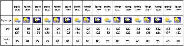 Հուլիսի 14-ի երեկոյան ժամերին, 15-ին և 19-ին՝ գիշերը և կեսօրից հետո քաղաքի առանձին հատվածներում հնարավոր է, 16-18-ը՝ գիշերը և կեսօրից հետո սպասվում է անձրև և ամպրոպ, ամպրոպի ժամանակ` քամու ուժգնացում՝ 15-20 մ/վ արագությամբ:
