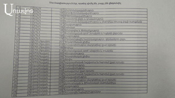 Գնահատման եւ թեստավորման կենտրոնի տնօրենի ժամանակավոր պաշտոնակատար Արմեն Փաշայանն էլ նշեց, որ դիմորդների թվի աճ է նկատվել Տեղեկատվական տեխնոլոգիաների, ինֆորմատիկայի գծով: Կարո Նասիբյանն էլ ավելացրեց, որ 29 մասնագիտությունների համար մի շարք բուհեր այս տարի ուսանողներ չեն ունենա. «Խոսքը հիմնականում Մանկավարժական համալսարանի մասին է: Դիմողներ չեն եղել նաեւ Բրյուսովի անվան համալսարանի եւ Շիրակի պետական համալսարանի որոշ մասնագիտությունների համար, այդ թվում՝ բնագիտություն, լրագրություն, սուրդոմանկավարժություն: Որոշ դեպքերում դիմողներ եղել են, բայց չեն ընդունվել»: