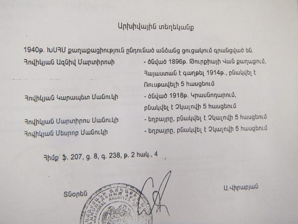 Մինչդեռ, դատարան էր ներկայացվել վկաների վկայությունները, արխիվային տեղեկանք, որտեղ հստակ երեւում էր, որ դեռ անցյալ դարի քառասունականներից, ԽՍՀՄ քաղաքացիություն ստացածների ցուցակում գրանցված Հովիկյան Ազնիվ Մարտիրոսի բնակվել է Ռուսաթավելի 5, իսկ պապը՝ Հովիկյան Միհրան Մանուկի, բնակվել է Չկալովի 5 հասցեում՝ Կոնդ թաղամասում: