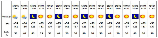 Հուլիսի 26-ի երեկոյան ժամերին հյուսիսային, առանձին շրջաններում կեսօրից հետո սպասվում է կարճատև անձրև և ամպրոպ: 27-31-ը սպասվում է առանց տեղումների եղանակ: