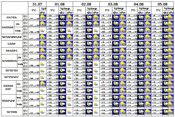 Հուլիսի 31-ին, օգոստոսի 1-2-ը՝ երեկոյան ժամերին, քաղաքի առանձին հատվածներում հնարավոր է, 3-5-ը՝ գիշերը և կեսօրից հետո, սպասվում է անձրև և ամպրոպ: