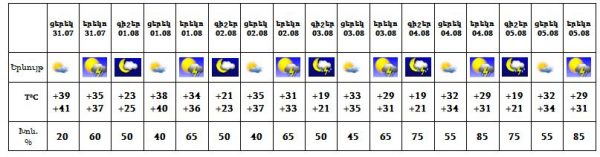 Հուլիսի 31-ի երեկոյան ժամերին առանձին շրջաններում, օգոստոսի 1-2-ը հյուսիսային շրջաններում, 3-5-ը, շրջանների զգալի մասում, գիշերը և երեկոյան ժամերին սպասվում է անձրև և ամպրոպ, առանձին հատվածներում հնարավոր է նաև կարկուտ: