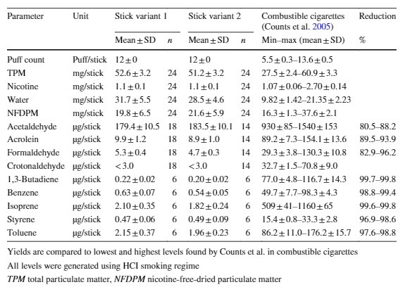 Ռիսկերի գնահատման Գերմանիայի դաշնային ինստիտուտի (BfR) “Թունաբանության արխիվներ” պարբերականում հրապարակված ուսումնասիրության[1] արդյունքներով հաստատվել է, որ տաքացման համակարգերի արտանետած գոլորշում հիմնական քաղցկեղածին տարրերի մակարդակը՝ ավանդական ծխախոտի ծխի հետ համեմատած զգալիորեն քիչ է: Արտադրող կազմակերպությունների պնդումն այն մասին, որ գոլորշու մեջ ուսումնասիրված վնասակար և պոտենցիալ վնասակար 9 տարրերի մակարդակը 80%-ից մինչև 99-ով նվազում են, նույնպես իրական է: Սա, բնականաբար, հանգեցնում է առողջապահական ռիսկերի զգալի նվազեցմանը, ինչը, այնուամենայնիվ, չի նշանակում նրանց իսպառ բացակայությունը: