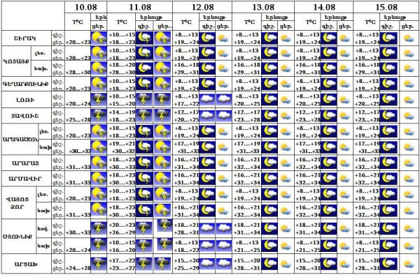 Օգոստոսի 10-ին՝ կեսօրից հետո, 11-ին՝ գիշերը և երեկոյան ժամերին շրջանների զգալի մասում սպասվում է անձրև և ամպրոպ, առանձին հատվածներում հնարավոր է նաև կարկուտ: Օգոստոսի 12-15-ը սպասվում է առանց տեղումների եղանակ։