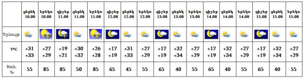 Օգոստոսի 10-ին՝ երեկոյան ժամերին, 11-ին՝ գիշերը և երեկոյան ժամերին քաղաքի առանձին հատվածներում հնարավոր է անձրև և ամպրոպ, ամպրոպի ժամանակ քամու ուժգնացում՝ 18-20 մ/վ: 12-15-ը սպասվում է առանց տեղումների եղանակ: