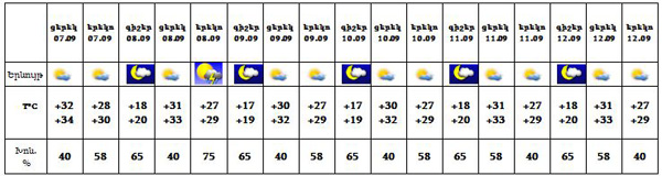 Սեպտեմբերի 7-ի ցերեկը, 10-12-ը սպասվում է առանց տեղումների եղանակ, 8-ի երեկոյան ժամերին քաղաքի առանձին հատվածներում սպասվում է կարճատև անձրև և ամպրոպ: