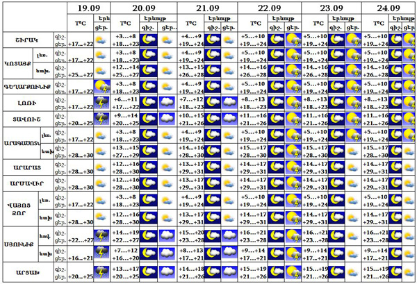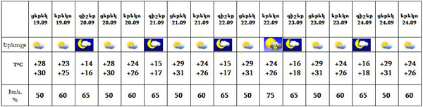 Սեպտեմբերի 19-ի ցերեկը, 20-21-ը, 23-24-ը սպասվում է առանց տեղումների եղանակ: Սեպտեմբերի 22-ի երեկոյան ժամերին սպասվում է անձրև և ամպրոպ, ամպրոպի ժամանակ՝ քամու ուժգնացում՝ 15-20 մ/վ: