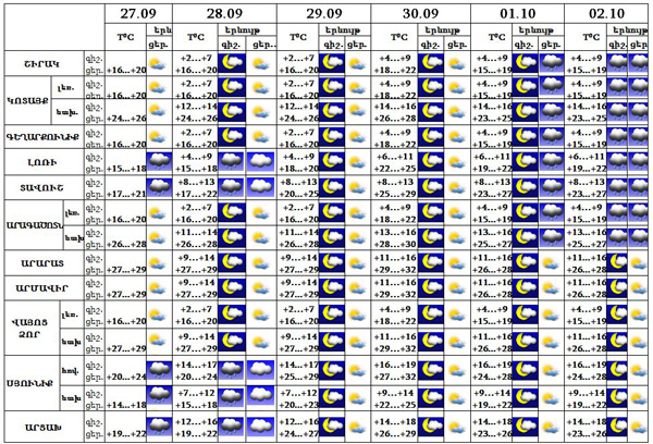 Սեպտեմբերի 27-ի ցերեկը, 28-30-ը, հոկտեմբերի 01-02-ը սպասվում է առանց տեղումների եղանակ: