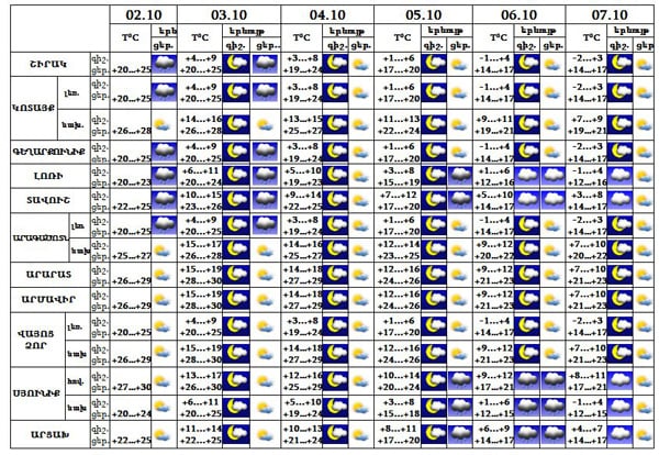 Հոկտեմբերի 2-ի ցերեկը, 3-ին հյուսիսային շրջաններում, 5-ին Լոռիում, Տավուշում, Սյունիքում և Արցախում, 6-ին Սյունիքում և Արցախում սպասվում է անձրև: Հոկտեմբերի 4-ին, 7-ին սպասվում է առանց տեղումների եղանակ: